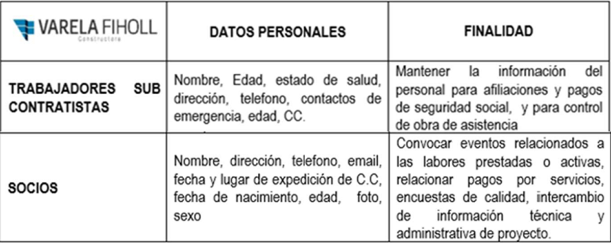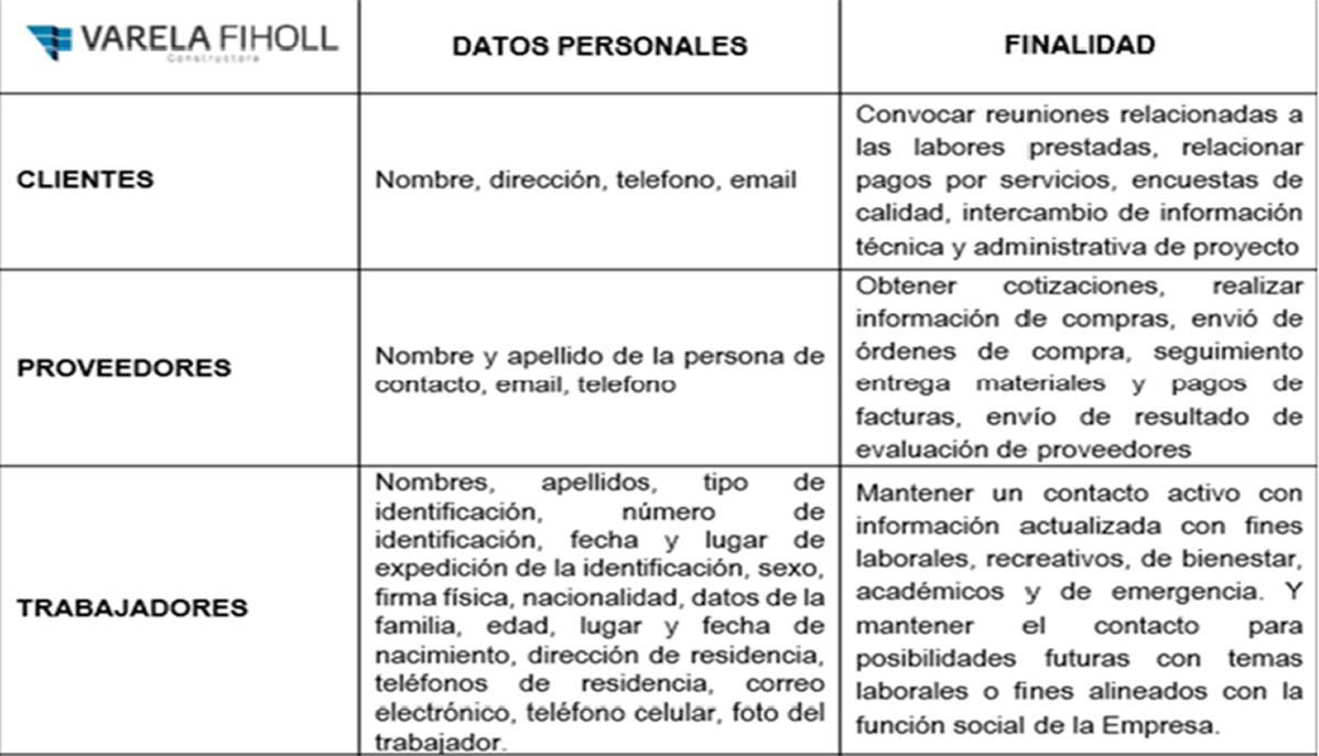 VARELA FIHOLL & CIA SAS, compañía encargada de ejecución de actividades de planeación, diseño, consultoría, interventoría, construcción y operación de todo tipo o clase de obras de ingeniería civil, ya sean públicas o privadas en desarrollo de su actividad comercial, recoge, almacena y utiliza información personal de sus clientes, empleados, proveedores, y personas naturales que podrían llegar a tener una relación contractual o legal con la sociedad.