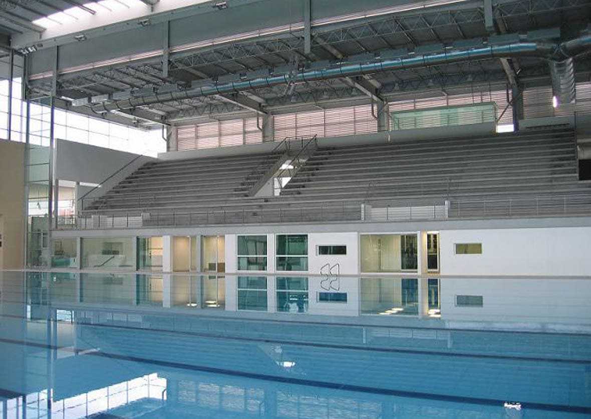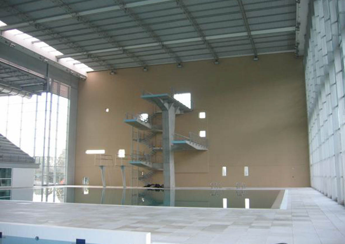 Un centro de competencia de nivel internacional. El proyecto incluye 3 piscinas: Olímpica (50m), de Entrenamiento (25m) y de Clavados (5m prof.). Destaca la construcción de la plataforma de clavados en concreto (3m, 5m, 7.5m y 10m) y una estructura metálica con luces de hasta 50m. Incluye graderías para 1.500 personas, zonas húmedas, gimnasio y cabinas de prensa.